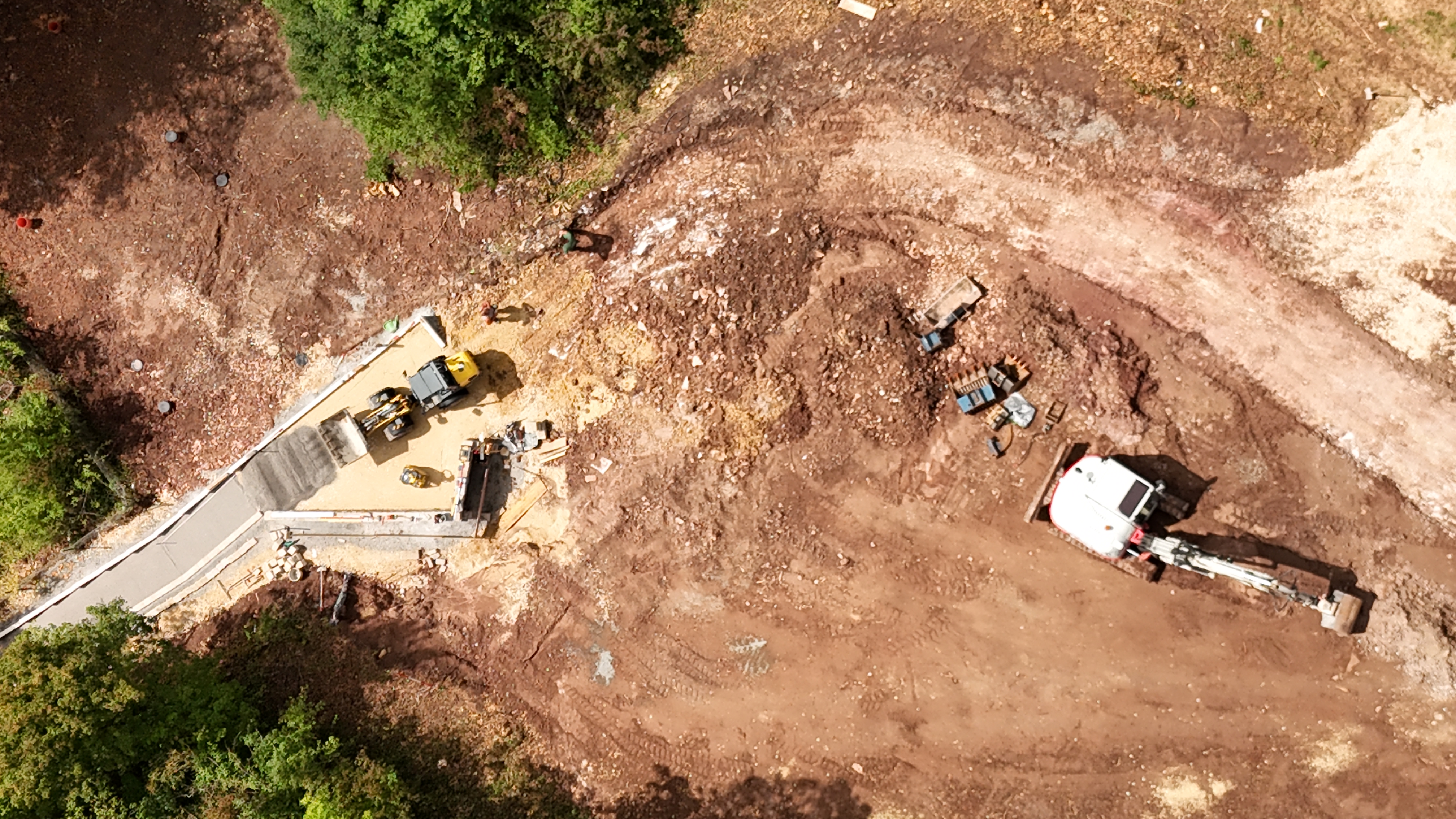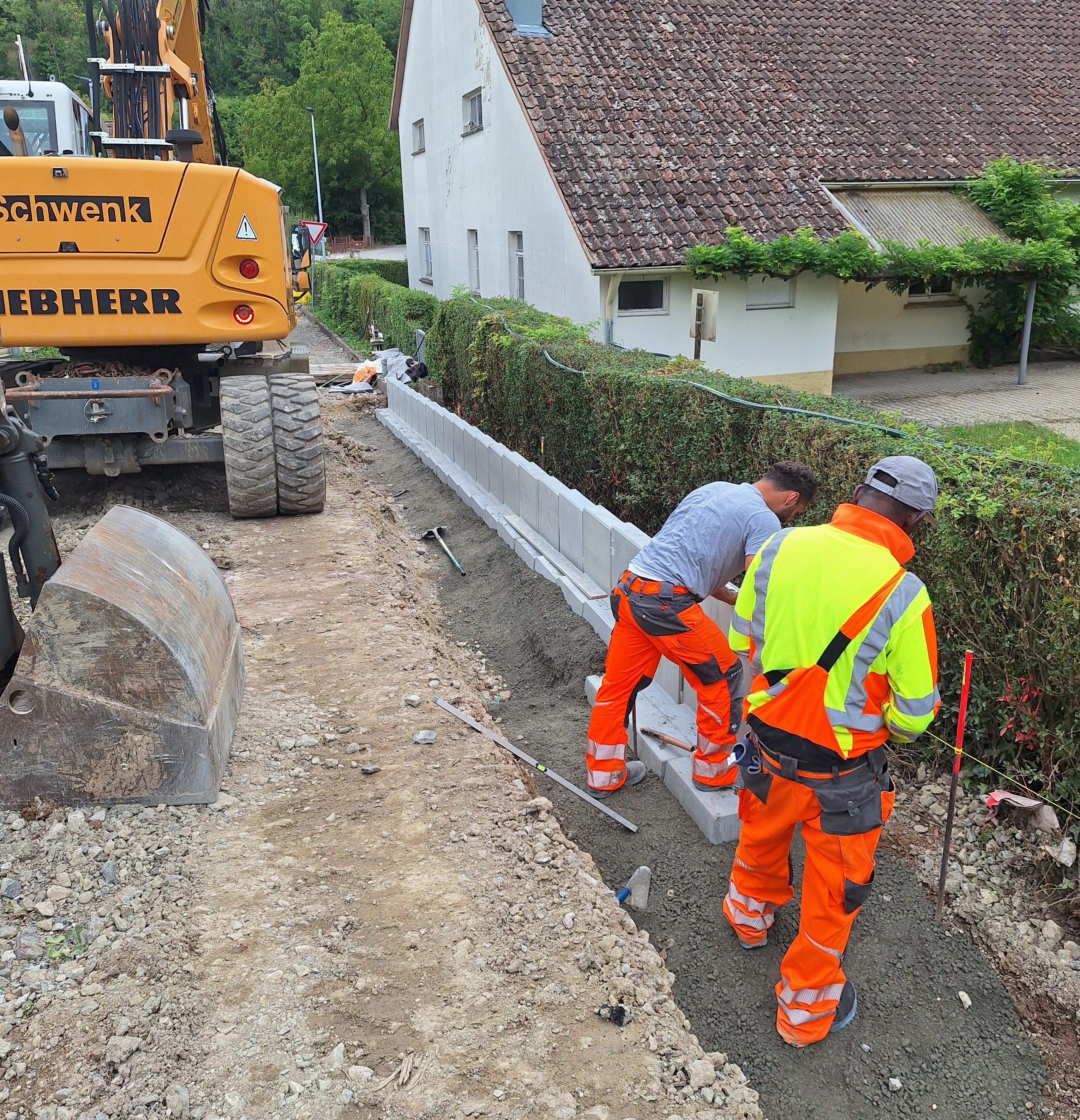 Los 2 ist die sogenannte äußere Erschließung und findet im Bereich Bahnhofstrasse, Tieräckerweg und Brühlweg statt. Die Arbeiten hierzu begangen am 14.7.2025. Nach Sperrung der Bahnhofstraße im Kreuzungs- und Einmündungsbereich zum Brühlweg, werden die Arbeiten nun Richtung Tieräckerweg fortgesetzt.
