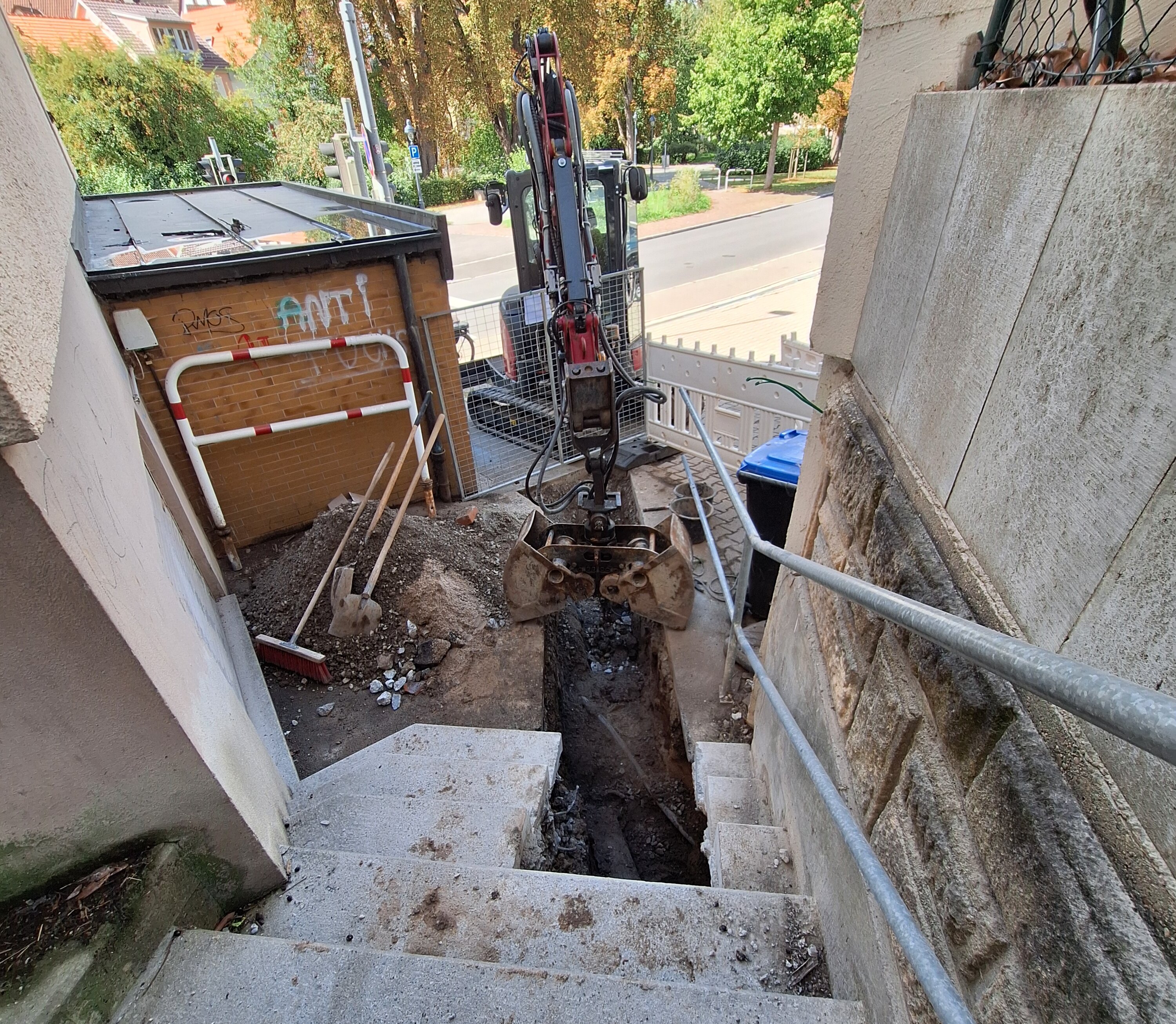 Am Fusspunkt der Schulstaffel bei der Nürtinger Strasse wurde leider ein Kanalbruch festgestellt.