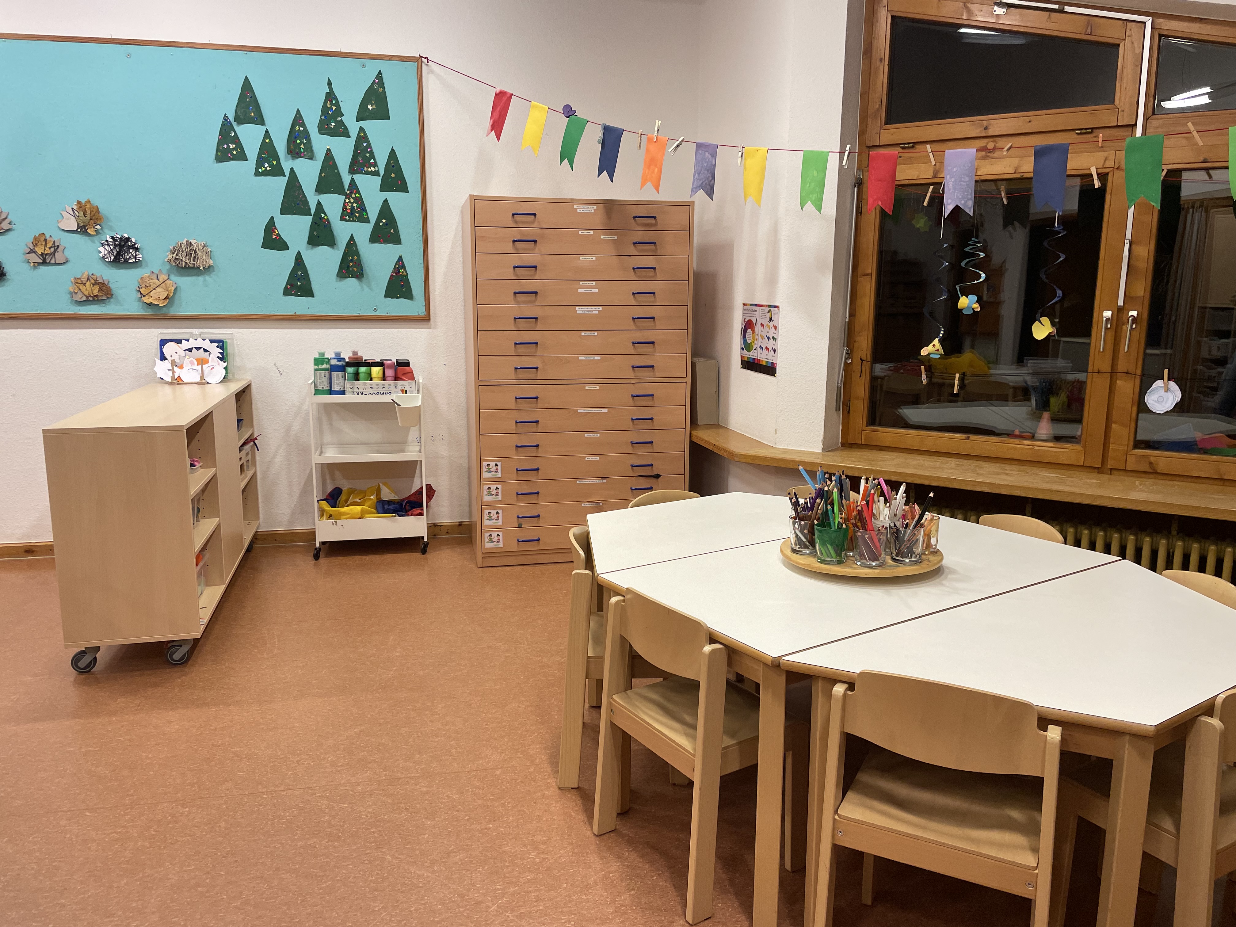 Durch das offene Konzept können die Kinder selber entscheiden, wo und mit wem sie spielen möchten. Dadurch entsteht mehr Entwicklungsfreiraum für das einzelne Kind, seine Bedürfnisse werden berücksichtigt und die Selbstständigkeit wird gefördert. Damit die Kinder ihren Interessen in Ruhe nachgehen können, gibt es verschiedene Funktionsbereiche, wie beispielsweise einen Kreativbereich, eine Bau- sowie Forscherecke oder einen Rollenspielbereich. Die Materialien werden dabei immer wieder ausgetauscht und orientieren sich an den aktuellen Themen der Kinder.