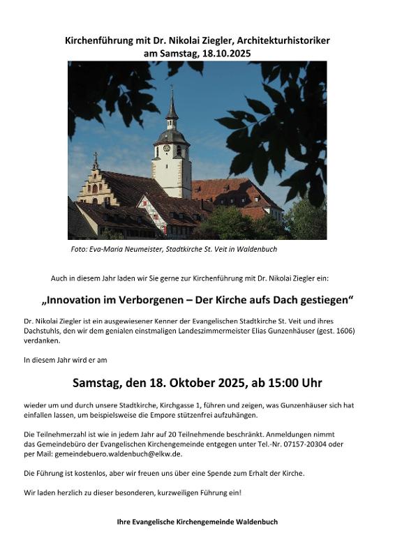 Zurück Sat, 18-10-2025 | 15:00 Uhr Kirchenführung www.waldenbuch-evangelisch.de Veranstaltungsort Evangelische Kirche St. Veit Evangelische Kirche St. Veit Kirchgasse 1 71111 Waldenbuch OpenStreetMap Public transportation Veranstalter Evang. Kirchengemeinde Waldenbuch