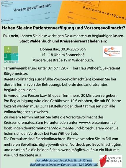 Zu diesem Termin nutzen Sie bitte die Vorsorgevollmacht des Kreisseniorenrates. Zum Herunterladen unter www.kreisseniorenrat-boeblingen.de/informationen/dokumente-und-broschueren/ oder Sie