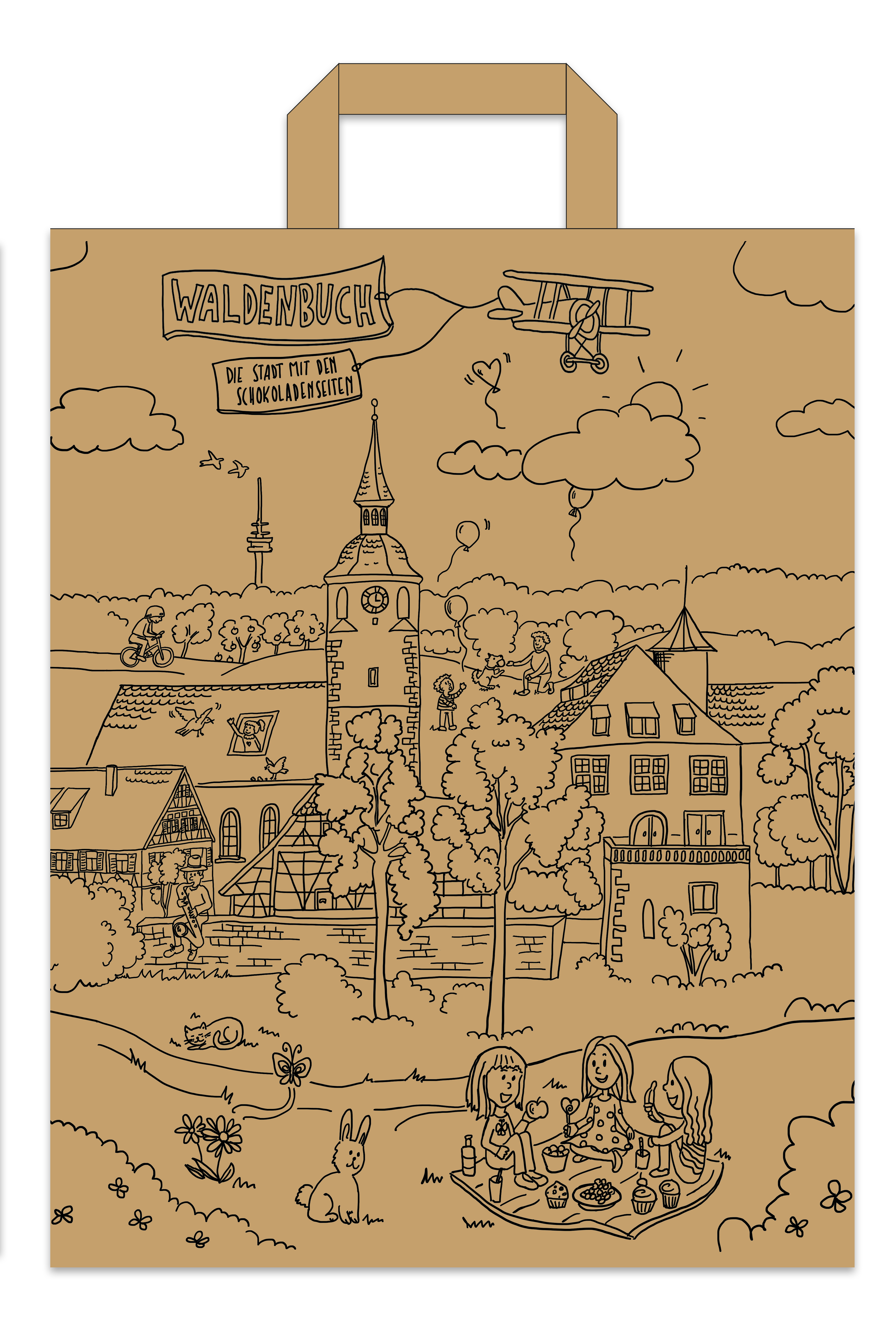 Durch das ansprechende Design, das Unternehmer, Gewerbe- und Handelsverein sowie Stadt gemeinsam entworfen haben, eignet sich das Waldenbucher Tütle nicht nur als Einkaufs- und Biomülltüte, sondern auch als Geschenktüte für Verwandte und Bekannte. Während die Außenseiten des Tütles die Stadt Waldenbuch, ihre Stadtteile und Besonderheiten zeigen, kann das Innenleben mit vielen Leckereien aus der Stadt mit Schokoladenseiten befüllt werden.